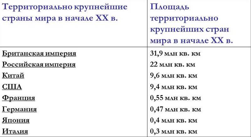 По данным на 1900 г., площадь колониальных владений составляла 54,9% площади мира. Там проживало свыше 35% населения Земли. Крупнейшей метрополией являлась Великобритания - в ее колониях проживало около 70% всего населения колоний, во французских - 9,5%, германских - 2,3%.